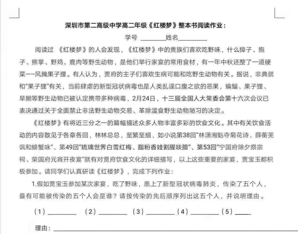 我有个上网找比我更惨的人的恶习。今天看到一道网课题:如果贾宝玉得了新冠肺炎,请按顺序列出最应该被隔离的五个人是谁?给出理由。这是深圳二中高二的题,下面链接里有学生回答的图片,字都写得不错啊。